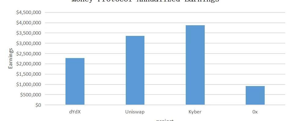 去中心化交易所慢慢抢夺中心化交易所的流量,也是非常有可能的。那么去中心化交易所中杠杠交易的盈利如何呢?选取了4个DEX的盈利如下图,dYdX的的盈利处于中间水平。如果放到整个DEX市场中,那么dYdX处于头部地位。