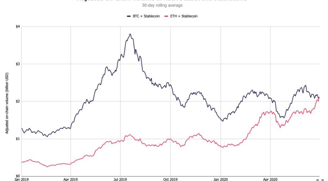 资料来源:CoinMetrics,TheBlockResearch如果把在比特币和以太坊上结算的稳定币计算在内的话,在6月底的时候以太坊的链上交易量几乎超过了比特币。