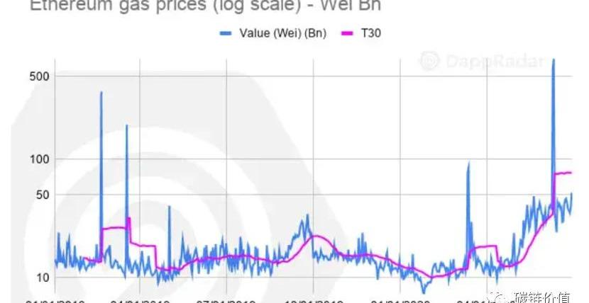 以太坊区块链要考虑另一个重要方面是gas价格。与前几个季度不同,在2020年第二季度期间gas价格突然激增,这可能是因为DeFi和DEX交易量暴涨所导致。然而,gas费用上涨对游戏类DApp影响非常大,直接导致二季度日常活动量减少80%。