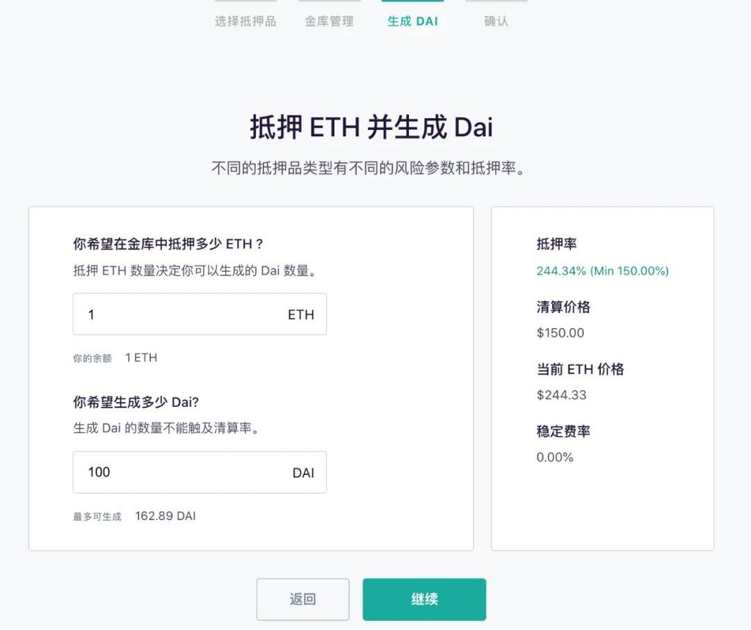 3.初次开启金库借Dai,需要进行授权。下一步填入抵押的ETH以及借Dai数量。确认金库细节后点击。