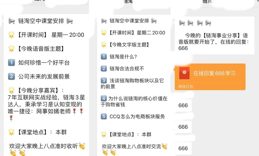 △左为秘乐达人收益,右为链淘达人收益,诱惑加码到这一步,一些想“搏一搏,单车变摩托”的人,基本已经被眼前的高收益冲昏了头脑,开始积极推广、发展下家。毕竟邀请成功一批用户后,邀请者就能直接获得收益分成,且这些用户后续在这平台的一切操作,作为上家也能享受收益,真正实现睡后收入,躺赚稳赚。一旦下家成功注册,他们便会被邀请进微信群,群里的几位管理员除了时不时晒晒自己的高额收益,鼓励并鞭策下家们努力发展新玩家外,还会定期或不定期的安排课程,邀请专门的讲师给群友授课。