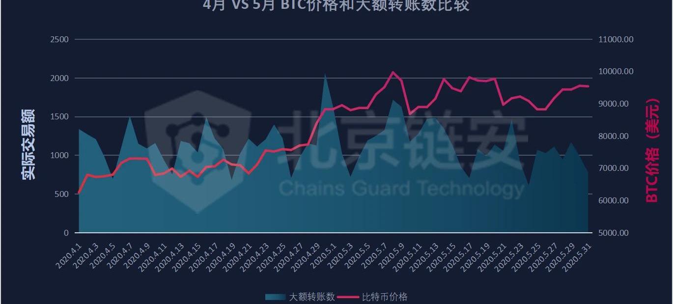 2020年5月的链上大额转账数为35165次,比2019年4月的34190次上涨了2.85%。