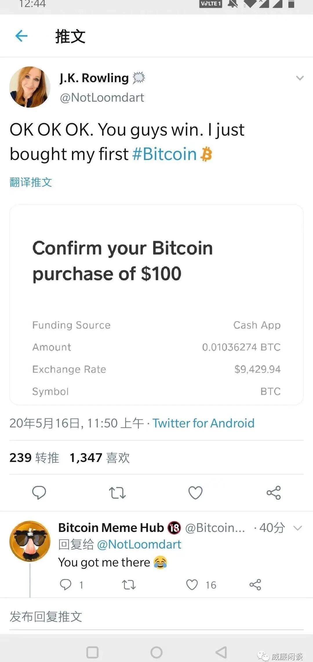 “这一开始只是一个玩笑,但现在我恐怕再也不能登录Twitter而不让别人因为我没有比特币而生气了。如果有一天你会在街上看到一个迟暮的老妇人,她正试图用一本《哈利波特》的书换一个土豆。请对她好一些,因为她正努力去理解。”大家也可以看到,这么些Twitter都是在试着帮她理解比特币,JK罗琳接受着比特币爱好者们的各种解释,并转发她认为不错的进行回应和讨论。2我寻根溯源了一下,发现开端是Coindesk的记者和编辑发了条推说“我这周看到的最乐观的信号是一位主流小说家(我不愿说出她的名字,但她太棒了,不是科幻小说那种类型的人)让我(主动地!)询问有关比特币的问题。”然后JK罗琳在下面回复:我不懂比特币,可以跟我介绍一下吗?