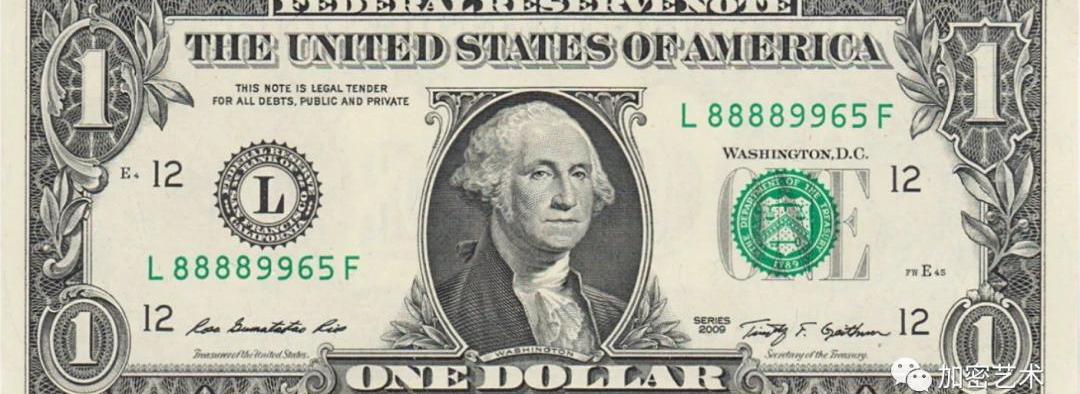 ONEDOLLAR“既然美元是以黄金作为背书发行的资产,那么以美元作为背书,以TOKEN形式存在的「1美元」NFT价值如何?”「1美元」采用的是第一种区块链与艺术的结合方式,将内容进行映射上链。由于美元的特殊性,通过美元纸币背书发行「1美元」从而实现了信用创造。同时,这也是USDT等法币背书型稳定币的铸造机制。