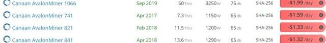 现阶段,嘉楠科技旗下每种AvalonMiner矿机型号挖掘比特币每天亏损金额在1-2美元,具体如下所示:
