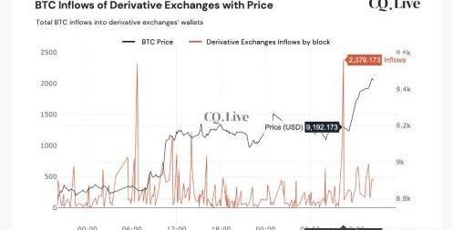 2.在昨日中国时间下午6:28分,超过2KBTC流入衍生产品交易所。一般也代表价格波动性会有所增长。价格也是从那时候开始从9100最高今早7点涨到了9600.一般情况进入交易所的BTC数量增加意味着卖压。但大量进入衍生品交易所的BTC意味着波动性增加。因为存放在衍生产品交易所中的BTC可以用作做多和做空的保证金。