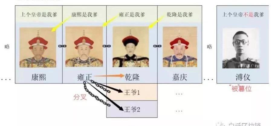 在讲区块链为何能防篡改之前,我们先来回顾一下历史。熟知历史或古装剧看多的朋友,应该都知道的几个史实:康熙皇帝后面的三个皇帝,分别是他的儿子雍正、孙子乾隆、曾孙子嘉庆;这几个都是子承父业继承皇位;每个皇帝都有很多儿子。
