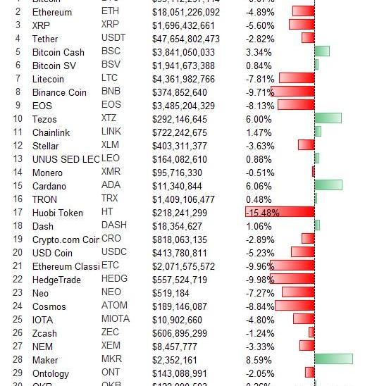 \t3.交易量分析\t\t从今日的交易量来看,\t排名前30的币种\t整体都在下跌,\t这说明今日市场交易并不活跃。\t今日虽然整体恐慌指数并不高,并不能说明市场情绪的悲观,但\t随着今日价格的波动,大部分币种都有小幅度下降,\t一定程度上表现出大部分投资者都为观望的心理。其中,火币交易量变化最大,减少了15%左右,前几日火币交易非常活跃,现在逐渐降温。而排名前30的大部分币种交易量都在5%至10%之间。