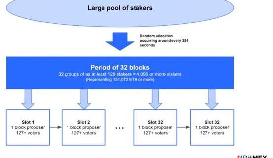 PoS是根据累积最多的stake来选择分叉规则的一般思路。当然我们还面临着如何构造投票过程的问题。以太坊2.0投票系统背后的核心原则与2018年以太坊提案所说明的并没有变化,它仍然是基于CasperFriendlyFinaltyGadget的想法。但是,基于CasperFriendlyFinaltyGadget和theLatestMessageDriventGreedyHeaviestObservedSubtreeFork选择规则的结合,这个系统已经更新了。我们将通过将投票系统分解成几个组成部分来解释投票系统的基本机制。首先要考虑的是我们有一个大的stakers池,每个staker最多代表32个ETH。这个池子不直接对区块进行投票,而是被安排进各种投票委员会中,其成员从更大的池子里随机抽取。设立委员会的原因是,不是每个staker都可以参与每个区块的投票,否则区块链上会包含太多的投票数据,而且无法扩展。委员会也有助于将投票数据聚合成可管理的数据块。因此会选择一个随机子集的staker在这些委员会中投票。Eth2规范将每个委员会的目标人数定位128,这是一个比较理想的最小值。我们认为实际上是存在区块选择的概率保证的。签署投票的签名可以进行聚合以减少所需的区块空间,确保网络可以扩展。