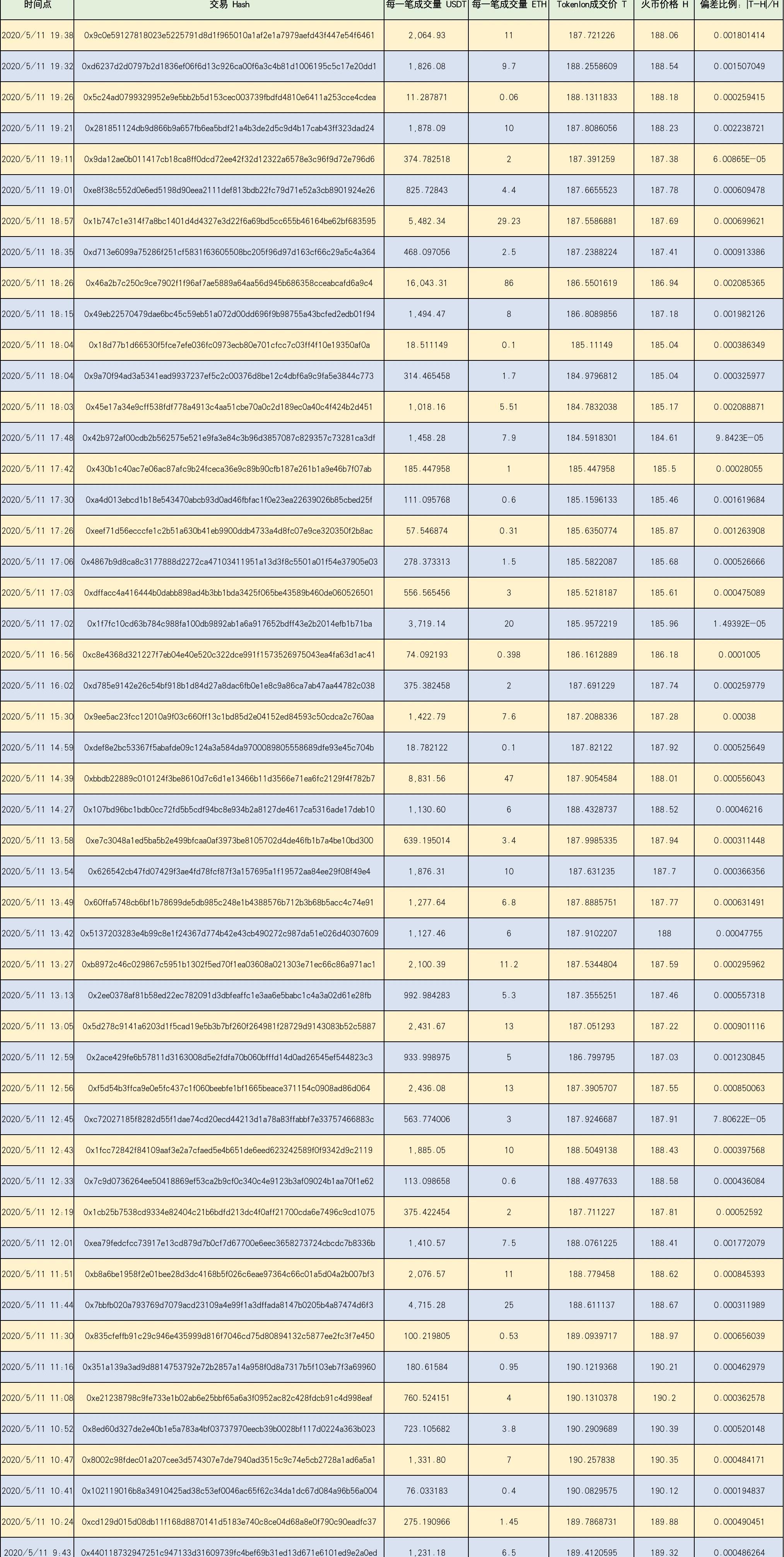 我们在2020.05.1124小时内,随机选择50条ETH/USDT的链上交易单;同上,在每一单闪兑交易时间点上找出与之对应的火币市场的交易价格,具体数据,如下图所示: