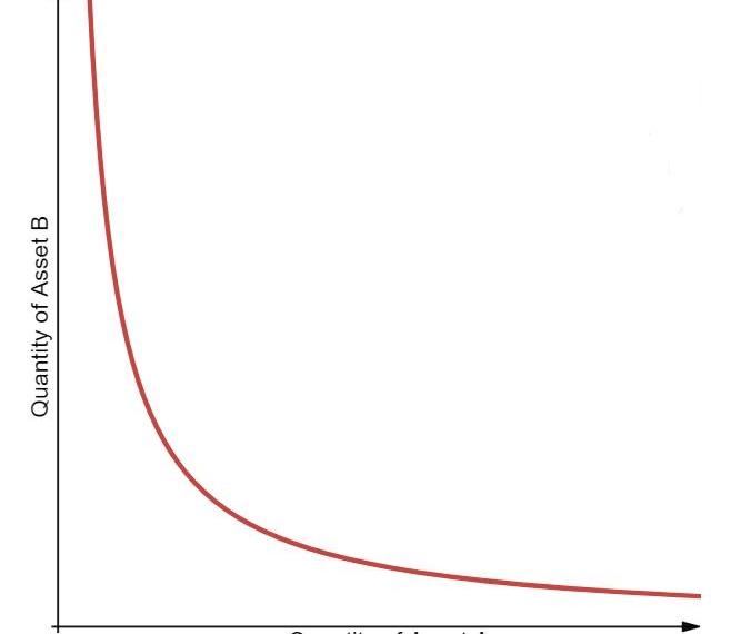 当我们用图表绘制「恒定乘积」模型中两个资产A和B的关系时,会形成一个双曲线,并且出现了一个非常理想的特质——当一方资产价格趋近于无穷时,市场仍能保有良好的流动性。恒定总量做市商
