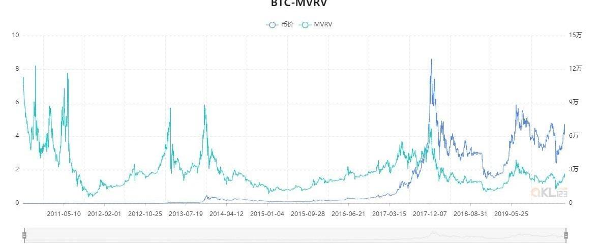 对比历史价格与泡沫指标可以发现:当泡沫指标为负时,可以被看作是买入的好时机;当该指标在50以上时,可以看作是卖出的好时机。与囤币指标相比,泡沫指数综合考虑了有关比特币的诸多要素,有着异曲同工之效,二者在使用时可作为互补。三、MVRV指标-长期是牛还是熊