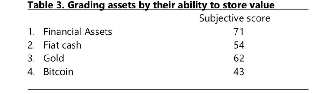 表格2全球未偿资产请记住,这里的挑战是去弄明白未来十年哪个价值存储手段(StoreofValue,SoV)会是赢家。第一件事是根据上面列出的4个标准对4项资产进行评分。所以我问询了研究小组的成员,以便了解这群见多识广的人是什么想法。经过讨论,我们创建了一个价值存储手段的评分系统,最高分100。我们认为不同类别的重要程度不同,所以购买力、可信度、流动性与便携性依次按照30分、30分、20分与20分进行分配。然后,我们对上面4组资产进行了价值评分,从而得出了表3所列的一套综合,但也高度主观的结果。