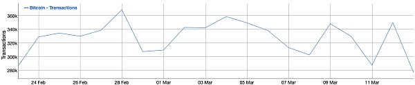 比特币交易量在3月12日飙升,这是市场出现大幅波动时的典型情况。3月13日,比特币以美元结算的交易量也出现了激增 ,每日转账笔数降至2月下旬的27.7万笔左右,自年初以来一直保持着正常水平。
