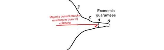 同样,如果一个共识攻击绕过了经济保障,社会保障仍然可以将其阻挡。如果一个拥有多数Hash算力的攻击者在完全接受了自己的经济损失的情况下,开始通过挖空区块对网络进行DOS攻击,那么矿工们可以投票决定改变PoW算法,从而移除该挖矿者的控制权。