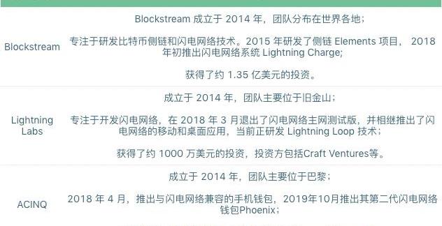目前主要有三个团队在进行闪电网络技术相关的研究开发工作,分别为:Blockstream、LightningLabs和ACINQ。上述三家团队均于2018年,分别推出了闪电网络的测试网。三个开发团队的信息如下表所示:
