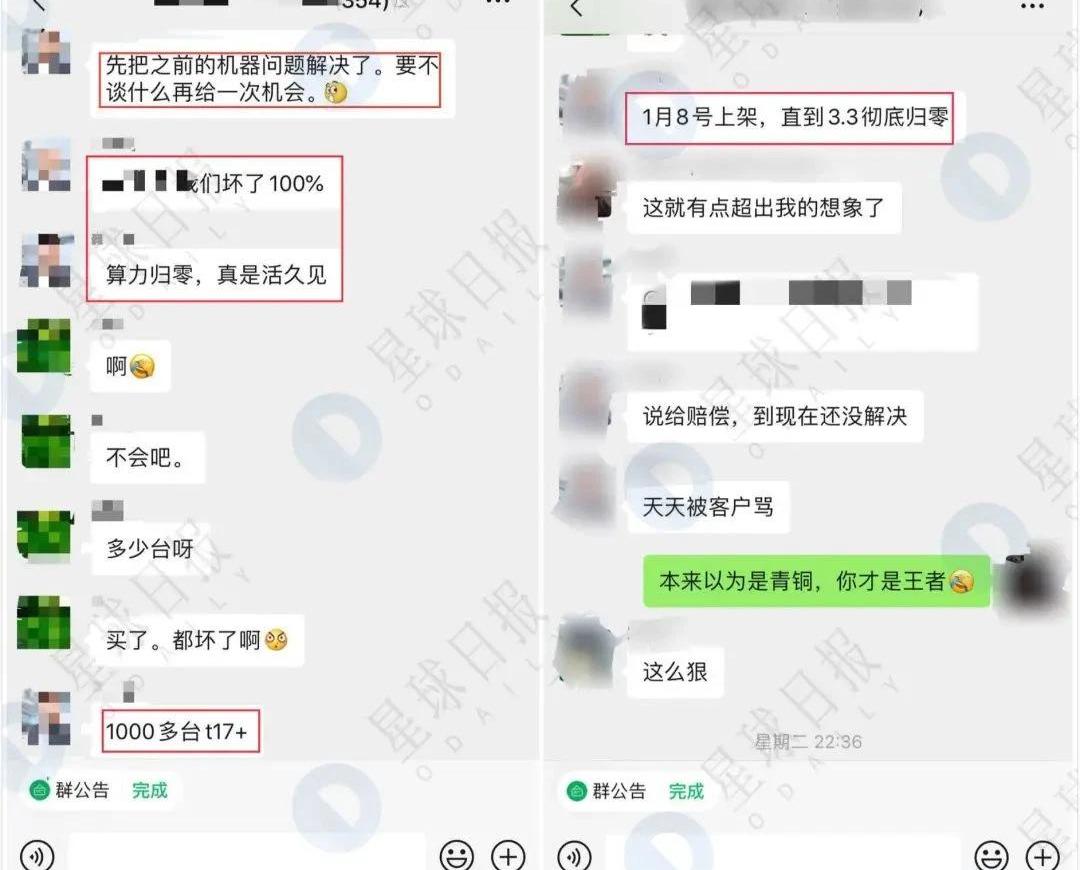 “维权群”截图,供图:林凯春部分群员自曝,其购买的“17”系列矿机,数量从几百台到数千台不等,坏损率高达20%-30%。故障原因集中于两点,一是散热片松动或移位导致算力板短路停摆、继而让矿机算力大幅下降,二是电源风扇故障、进而导致电源停摆。
