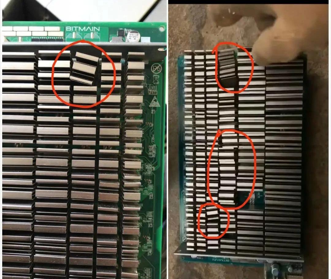 Rawpool矿池拆机神马M10蚂蚁矿机自S5+后便开始采用现在这种设计,其优点在于提升了散热能力,但也带来散热片粘接成本高、易松动倾倒等问题。对于造成本次T17e故障的原因,林凯春排除了人的操作和矿场环境这两个造成机器故障的主要因素。“矿场和机器都是自己的,我本人也在现场,也很用心在维护,不存在什么机器托管管理不当这种问题;矿场环境上,同一个矿场、同期还运行着蚂蚁T17、阿瓦隆1066、神马M21S,这些故障率都很低,几百台只坏掉了三个电源、一个风扇、一个算力板,我不认为矿场有什么问题。”林凯春表示。但从机器自身看,不少维权群成员推测出了问题根源。