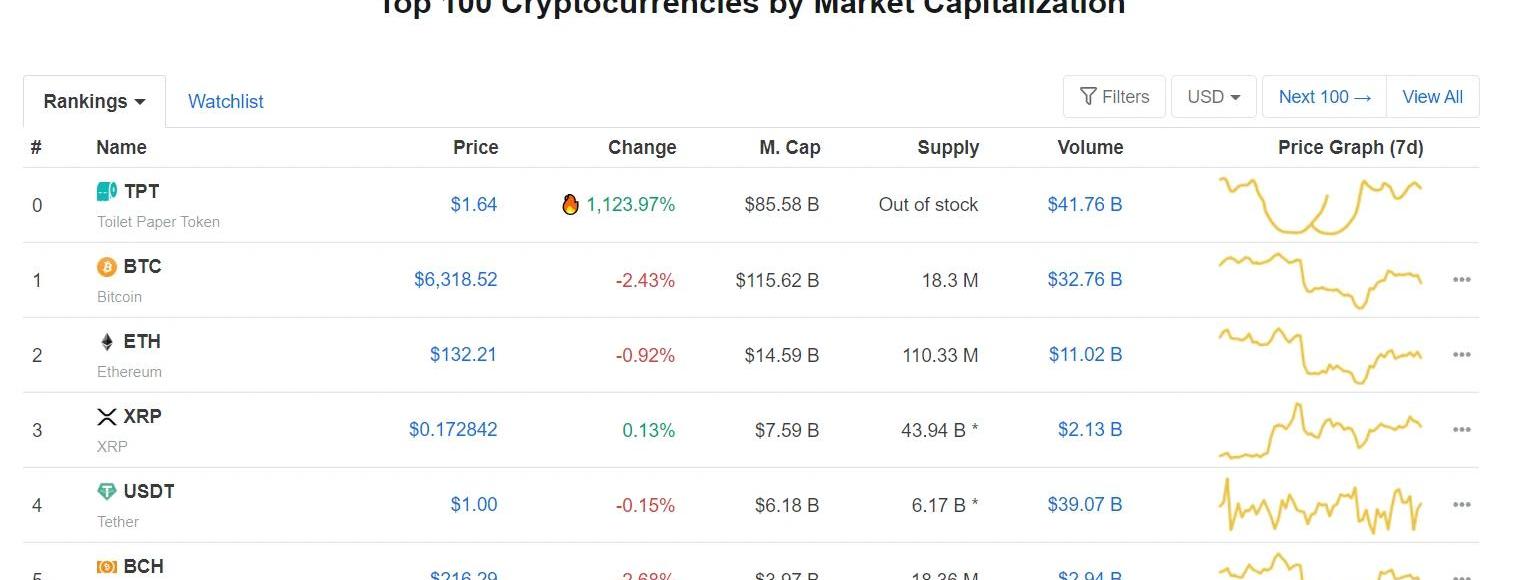 2020年愚人节适逢新冠病恐慌和市场下跌之际。鉴于各国政府告诫人们待在家里,以及人们对物资短缺的担忧,人们纷纷去超市抢购卫生纸,因而造成了卫生纸的短缺。厕纸已经成为了海外的新黄金,与两个月前的医用口罩类似。CoinMarketCap的厕纸代币在截止发稿时的价格为1.64美元,在过去24小时内上涨了1123.97%,成交量为417.6亿美元。厕纸币的走势图显示,该资产最近完成了一个漂亮的双底模式,表明会导致价格上涨。点击厕纸币就进入了CMC博客的一篇文章,文章详细介绍了各个年代的卫生纸,联系到了现在的消费者,自2019年底以来,他们囤积了更多的卫生纸。