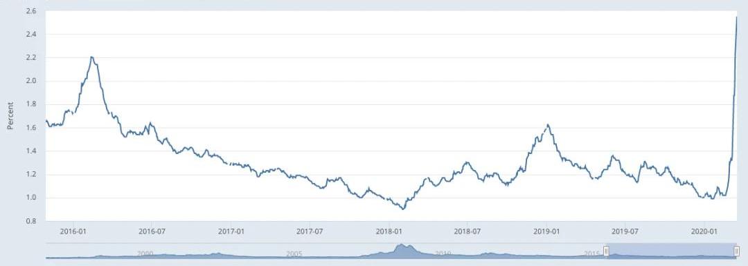冠状病对于经济的负面影响毋庸置疑,但其影响的是未来经济的增长和变化形势。这只是戳爆气球的那一根针,而流动性危机是导致气球表面失去弹性的主要原因。而美联储采取的降息至零和1.2万亿美元的刺激计划的主要目的就是遏制流动性危机。首先,在投资级公司债与国债的利率差已经达到2.6%,上次出现这种级别的利差和如此快速的涨幅还是在2008-2009金融危机期间。