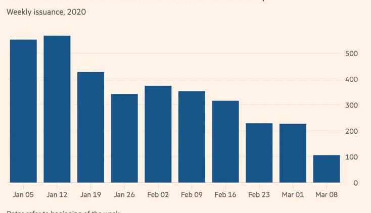 来源:FRED美国信贷市场的压力进一步加剧,一级市场的发行被关闭,零售商和能源生产商的债券遭到抛售。债券市场紧随全球股市暴跌之后,投资级信用衍生品指数上涨逾10个基点,高收益CDX价格跌至2012年以来的最低水平。美国的公司债券发行再次陷入停滞,原因是投资者对有关冠状病的最新消息做出了反应,并在等待特朗普政府承诺的经济刺激方案的消息。由于冠状病的爆发威胁到企业利润,信贷市场一直不稳定,而全球财政和货币政策的反应不一。因投资者撤出风险资产,美国垃圾债券基金料连续第三周录得逾40亿美元的资金流出,而新发债券数额也逐渐跌至冰点。