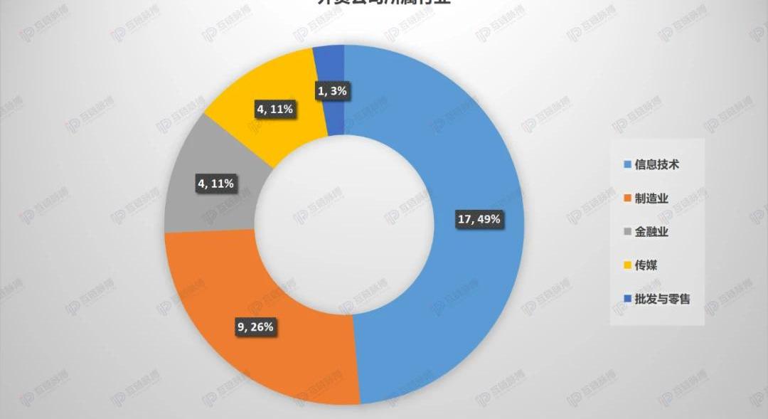 从外资公司所属的行业分类来看,信息技术类的公司17家,占比49%。信息技术类的公司包括了计算机、软件、通讯、区块链、物联网,其中通讯领域占到了6家。其次是制造业,9家占比26%。制造业企业中汽配、家电分别有4家、3家。金融业和广义传媒产业分别有4家,占比11%。