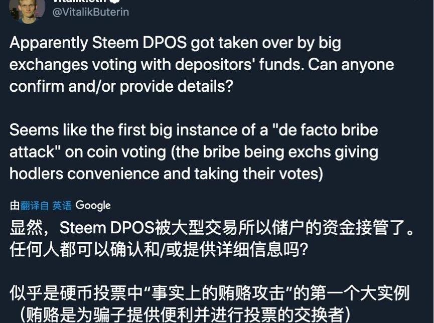 以太坊创始人Vitalik用“贿选攻击”评价此事之后,社交网络上质疑声四起。以太坊创始人Vitalik更是直指,这是DPos机制下“贿选攻击”的首次大型案例。新节点出现后,Steemit迅速完成了新版本升级,这一动作释放了他被冻结的价值1000万美元的Steem资产。孙宇晨后来的一系列回应,也证实了这些新节点出现和他的关联。他称,此举只是为了取回波场基金会合法持有的资产。在恢复Steem网络秩序后,他认为,此前的软分叉冻结资产是恶意的“黑客的犯罪行为”。余波远未结束,不仅Steemit公司团队的几名原有成员宣布辞职,也让外界重回DPos治理机制是否去中心化的讨论。此外,交易所动用用户资产投票的行为被推上了风口浪尖。DPos制下的寡头决策