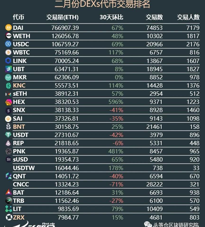 注:交易额通过智能合约统计,如果一个交易在Kyber上完成,而流动性来自Uniswap或Oasis,那么交易会被统计两次。整个二月份,统计中的DEXs总交易额为4.77亿美元,较一月份增长101.9%,这一方面得益于ETH价格的增长,另一方面得益于交易人数的增长。