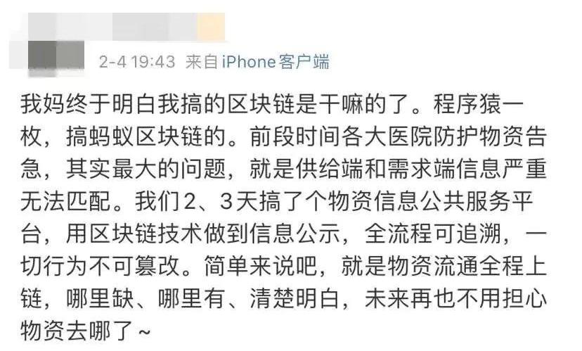 郝天在《疫情之后国家数字化治理体系的跃迁》一文中认为,在17年前的SARS非典疫情中,“我们真正收获的是一场基于互联网的‘网络问政’风潮”,在国家疫情预警系统、媒体舆论环境、公益民生服务遭受空前压力测试的情况下,“数字化治理同样也会被纳入国家下一阶段的治理体系当中。”而在数字化治理体系升级中,区块链则是不可替代的技术。区块链在政务流程透明、提升组织协同效率、加速数据资产化增进公益/民生/金融等垂直产业效益方面具备得天独厚的优势,并且“接下来很可能在区块链产业领域走出魔鬼般六亲不认的发展步伐”,国家会率先领队实施区块链治理方案,探寻区块链+政务/民生/供应链金融的落地可能,加速推进央行数字货币的发行,数据资产化会逐步发展。对此,去中心化电商平台Origin协议中国区CPOLeslie表示认同,“本次疫情对区块链行业利好的点有较明显的一个,是区块链溯源/认证/身份验证/支付等技术将会在此次疫情过后得到全球范围内的政府重视。”对于本次疫情及其暴露出来的社会问题,一方面,在最危急的情况下多个区块链企业都伸出了援手;另一方面,更有声音向政府机构提议,倡议成立区块链溯源、公益捐助系统等实在的应用。虎符长安认为这是一个非常好的现象,“区块链在过去经历了很多污名化的东西,但是在国家有难的时候,我们看到非常多区块链从业人员和企业都非常积极地做了一定的贡献,捐钱捐物啊,乃至倡议自己的用户去做些力所能及的事情,我觉得这个行为还是很为区块链行业去争光争气的。”做出援助其中就有来自蚂蚁区块链的程序员,他表示这些正能量的行为真的利用区块链技术做到“信息公示,全程可追溯”,还顺便让“我妈明白我搞的区块链是干嘛的了”。