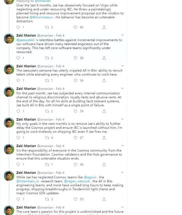 Jae离职的消息最早在1月29日从Twitter网友的爆料那传出,不过,Jae当时自己站出来回应称,现在不会离开,“而且目前Cosmos团队基本上是在没有我参与的情况下工作的。“Jae的声明暂时打消了市场担忧,消停没几天,ZakiManian的公开指责,再度将此事带回大众视野。Zaki列举了Jae的数宗罪,归结起来,主要是Jae在过去六个月,将主要的精力都投入到自己的Virgo项目中,同时项目因开发资源分配不均等问题,导致大量的优秀工程师离开了Tendermint公司。最后,Zaki表达了要带领Cosmos社区祛除Jae带来的不利影响,继续发展Cosmos并且保证IBC的开发进度。
