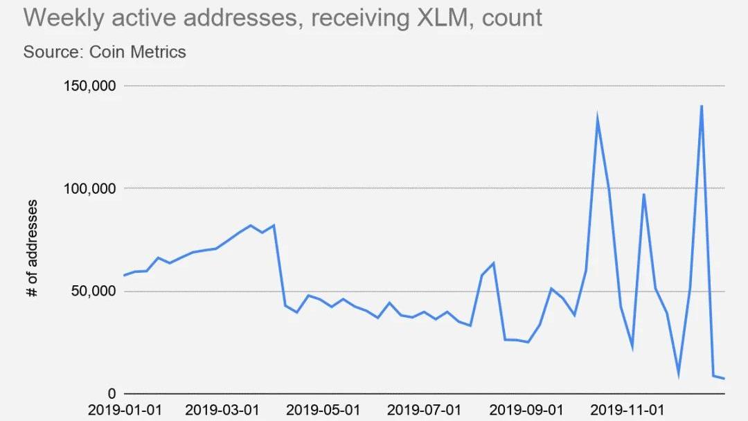 每周都会出现一次收款峰值。这就是通胀池在给用户分发收益。Stellar通胀真是一个绝佳例证:网络数据必须放在考虑网络自身特定的语境中来解读。除了按日观察收款活动,按周观察Stellar的活跃收款地址可以进一步平滑掉不规则发行所带来的影响。这样一来,我们就可以看出它跌到了数月以来的新低: