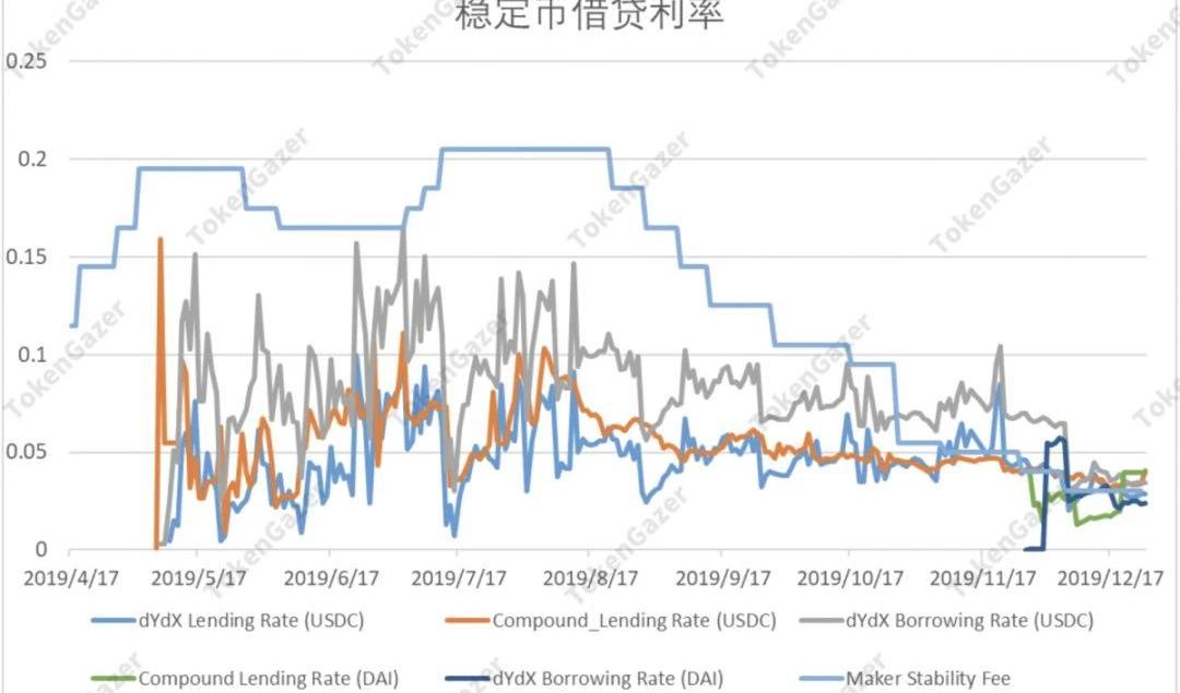 不同代币的出借利率也不相同,可以选择将低利率的资产抵押。例如,对于ETH持有者,如果在dYdX和Compound上以0.42%或0.12%的年化利率借出ETH,除去手续费几乎没有收益。这个时候采用上述方式,在dYdX中借入稳定币,再将稳定币借出或换成另一个利率更高的币种借出可以增加收益,但是在这期间每种代币的利率随时都可能发生变化。对于以太坊持有者,以前更常采用且规模更大的一种做法是将ETH在Maker中抵押生成稳定币SAI,再将SAI直接借出或换成其它利率较高的稳定币借出。从17年12月至18年8月26日以及18年12月17日至19年2月8日,Maker中稳定费的年化费率都只有0.5%。但是目前在Maker中抵押生成DAI/SAI的稳定费费率已经超过直接从dYdX中借DAI的利息。今年9月,BinanceResearch发表了一篇文章分析以太坊生态中的DeFi利差交易策略。其中DeFi间的利差交易策略总结为以下三点:Compound上SAI的出借利率高于USDC,可以将USDC换成SAI再借出,利用Compound上SAI的出借利率比USDC高套利。但现在Compound中USDC的出借利率高于SAI,而且这种情况可能再次发生转变,如下图所示。