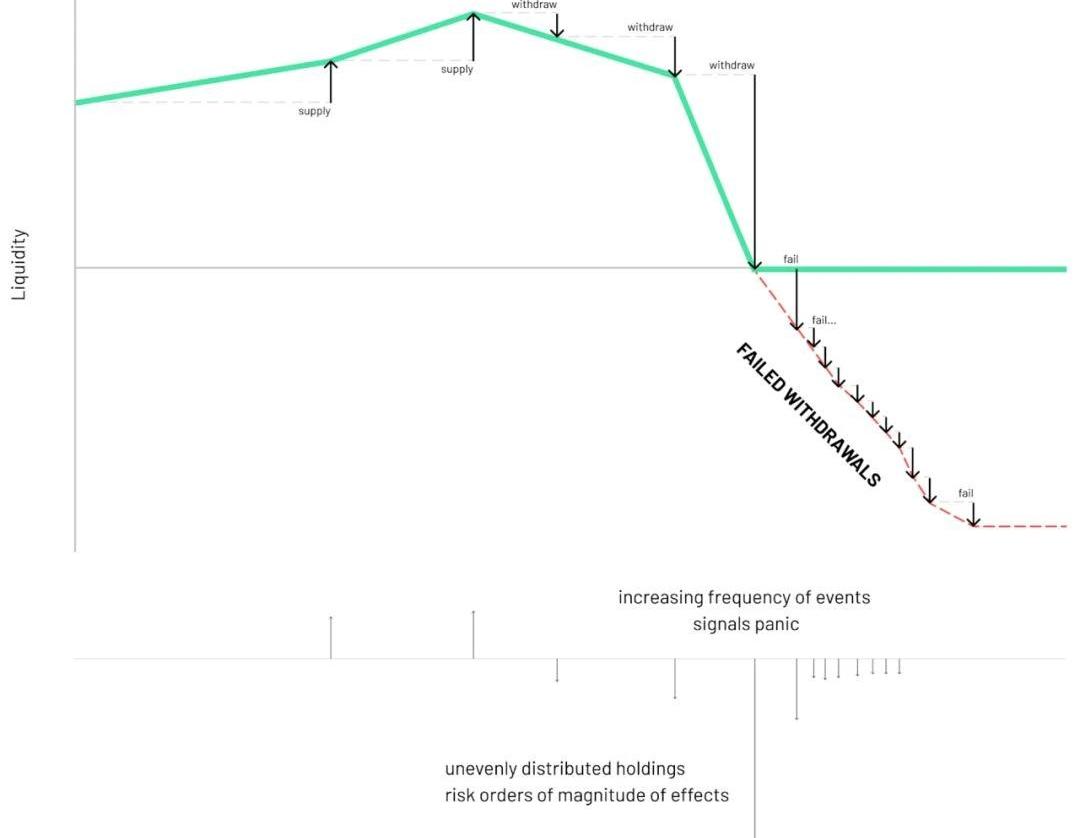 因此,我们根据这些图片可以得出结论:Compound金融中已经发生了至少五次准流动性枯竭以及一次实际流动性枯竭。有些人对此已有所警觉,但大部分人选择忽略这些事件。通过调整利率模型,协议重获其功能性以及流动性。但鉴于事实证明Compound的激励机制无法有效对冲流动性枯竭的风险,并且还会导致提现失败,我们必须准确评估银行挤兑发生的风险。一次被证实的流动性不足也许只会影响一位或数位用户无法成功提现,但银行挤兑却会让大量其它用户也无法提现,即使他们只持有相对较小的存款额。随着Compound用户基础的增长,贷款规模的扩大极大地削减了流动性,这可能让存款方陷入恐慌,并开始提现资金。首先,大额的提现会失败,同时随着流动池进一步缩小,越来越多的用户将无法成功取回他们的资金。最终结果将如同传统的银行挤兑一般,唯一区别是它发生于去中心化的平台。可以预见的是,类似这样的银行挤兑将会成为“黑天鹅”事件——也就是终生难遇的不可预测事件,因此也对于用户而言也难以预防。然而,我们已经知道历史上的五起流动性枯竭以及一次取款失败事件。此外,通过检测借出者与借入者,我们也能观察到,在某些时刻流动性有多接近于0点。缓解流动性不足与银行挤兑风险