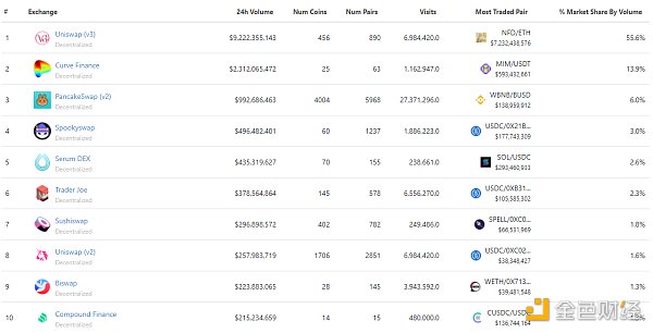 过去24小时去中心化交易所的交易量 数据来源:coinmarketcap