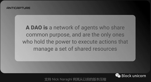 有了 Anticapture 框架,我们可以将 DAO 概念化为一种强大的抗捕获治理形式。从某种意义上说,这意味着 DAO 继承了父类抗捕获治理的基本属性。与任何抗捕获治理的实例一样,DAO 是代理网络,它们管理共享资源,并且它们有一个目的。