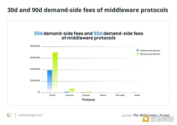 The Web3 Index追踪去中心化开发者堆栈各层服务协议产生的需求方费用(DSF)。例如,Pocket在30天内产生了390万美元的DSF,因为它采用了一种新颖的通缩支付模式。这意味着开发者通过稀释支付费用,而节点运营商则通过通胀获取收益。