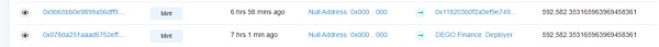攻击者通过私钥,使用minter权限分别向DEGO.Finance: Deployer账户和0x118账户铸造了592,582.35个dego代币。