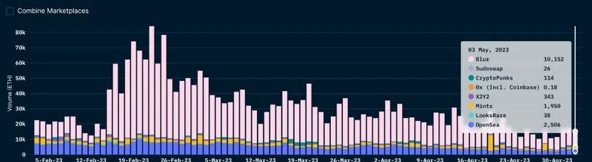 从市场的总volume看,近期一直处于下降趋势。NFT市场份额看blur占据约67.3%,基本与上周持平。opensea占据份额约为16.6%,相比上周下降~4%。从短期买家分析看,returningbuyer和firsttimebuyer都仍然在低谷附近。从NFT市场的概览来看,本周部分蓝筹NFT地板价回升,Azuki上涨6.43%,MAYC上涨4.99%。
