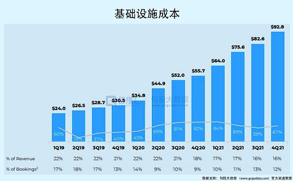 成本端上面,营收成本(cost of revenue)增长93%,近一年来首次超过营收增速(83%)。开发者和基础设施为成本端大头,占流水的比重基本稳定,Q4分别为21%和12%。人员成本占比也相对稳定,Q4为16%。EBITDA/Bookings 21.8%,也属于较好的水平。