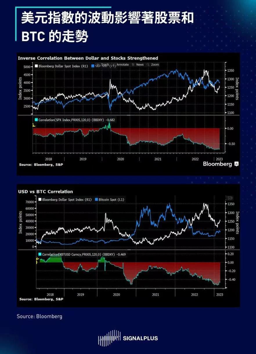 就推动市场的因素而言,考虑到终端利率最近已经重新定价走高,美元现在成为了最主要的风险晴雨表,它与其他资产类别的负相关性已升至过去5年来的最高水平。BTC和美元之间也有类似的关系,但程度较轻,目前几乎所有交易都是以美元为基础。