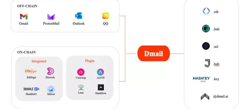 在具体应用上,Dmail的DaaS支持多链域名的聚合服务。当前主流公链的DID项目均可聚合到Dmail平台,实现用户DID域名的多平台一体化。