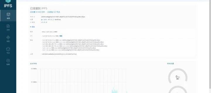 网站https://ipfs.io提供一个带UI界面的客户端,安装运行后会启动IPFS的服务,显示当前的节点ID、网关和API地址: