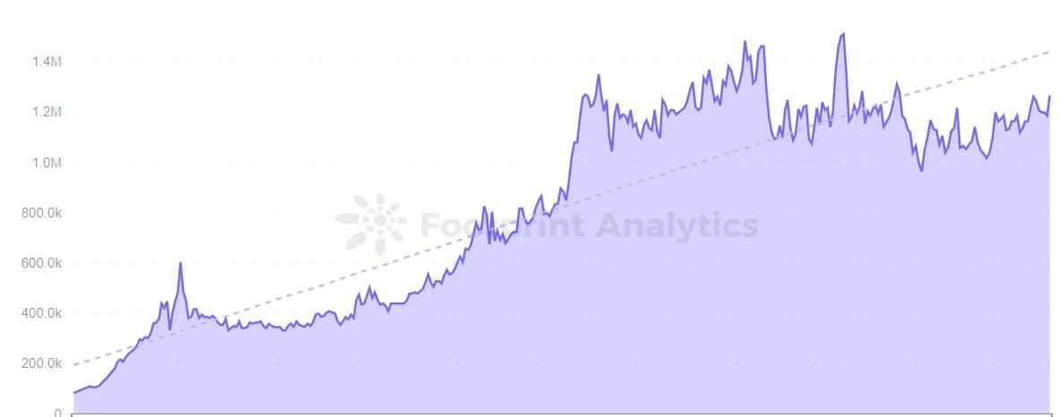 据FootprintAnalytics数据显示,自2021年4月以来,GameFi用户数呈上升的趋势,且达到一个平衡的趋势值。这与项目的快速增长和GameFi市场的不断发展高度关联。