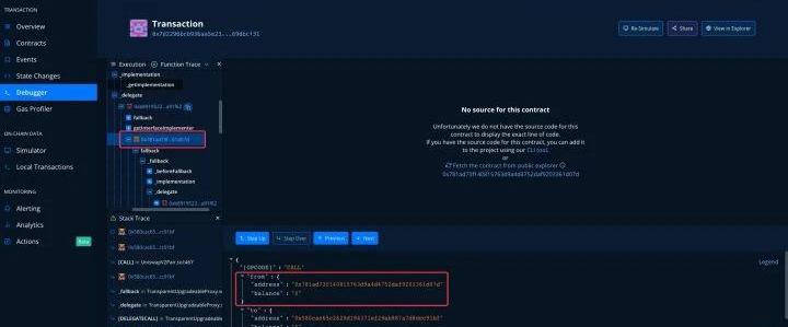 从Debugger中我们可以发现攻击合约的地址0x781ad73f140815763d9a4d4752daf9203361d07d。