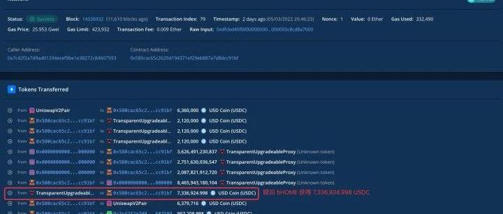 3.将刚才重入获得的bHOME拿去销毁赎回获得7,336,924.998USDC。