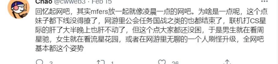 mfers社区成员对于这种反映了他们真实生活的抽象形象,不但没有反感,还以一种自嘲的姿态欣然接受。这个摊在椅子上,操控电脑,甚至悠闲地抽烟等一系列行为更是栩栩如生地描绘了在Web3.0世界里加密社群的生活状态,而在千禧年的网络冲浪文化里度过的mfer中国社区成员也被逗引起了自己怀旧情结;这也正是说明mfers角色所呈现出富有感染力的神态是具有超越时空限制的全球共性。