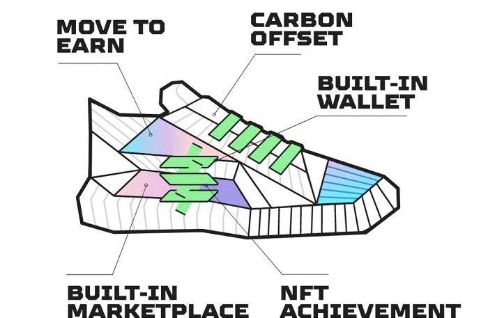 上图:STEPN推出的M2ENFT运动鞋形象地展现了其各种模块,分别有:Move-to-Earn、碳抵消、内置钱包、NFT成就徽章、以及内置市场。