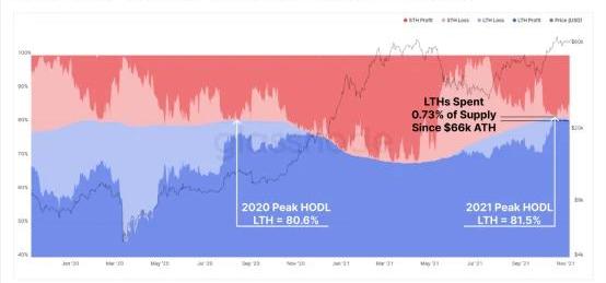2020年8月,长期持有者拥有的筹码占流通量的比例达到80.6%的高位,然后该比例逐渐下降至68%,直至2021年4月上涨至66000美元的阶段顶部。最近,长期持有者筹码占流通量的比例再次达到81.5%的新高,目前仅花费了流量量占比0.73%的筹码。