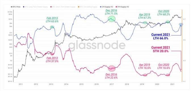 Glassnode:随着代币处于休眠状态,长期持有者的BTC持有量占供应量的比例继续呈上升趋势,目前该占比为66%。