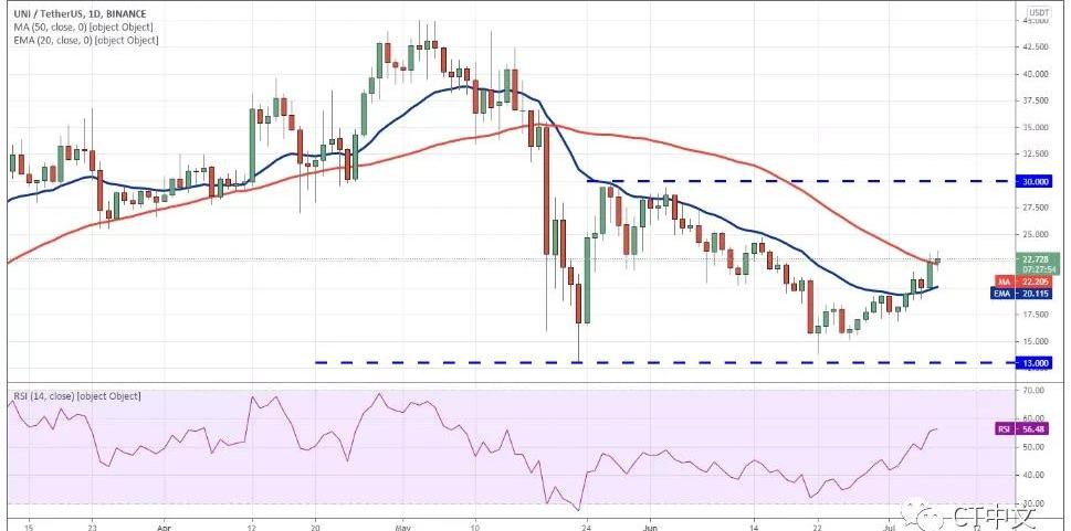 20天EMA已经开始转为上升,RSI已经上升到56以上,表明买方占据了上风。在25美元处有一个小阻力,但如果这个水平被越过,UNI/USDT可能上涨至27美元,然后是30美元。